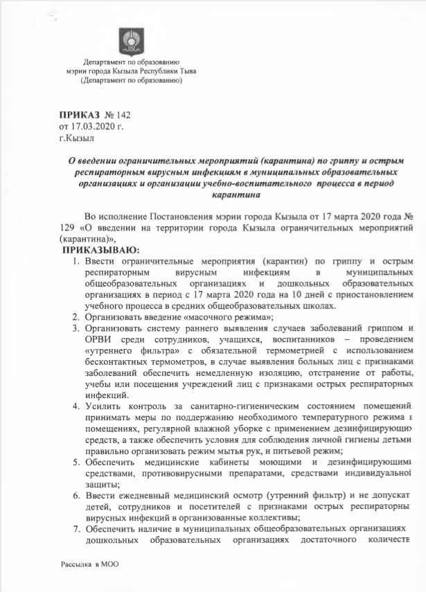 Приказом №142 от 17.03.2020 г. Введены ограничительные мероприятия (карантин) по гриппу и острым респираторным вирусным инфекциям в муниципальных общеобразовательных организациях и дошкольных образовательных организациях в период с 17 марта 2020 года на 10 дней с приостановлением учебного процесса в средних общеобразовательных школах.