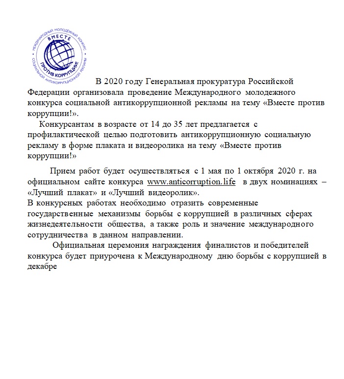 Без рубрики Молодежный конкурс социальной антикоррупционной рекламы на тему «Вместе против коррупции!» 22.05.2020 /